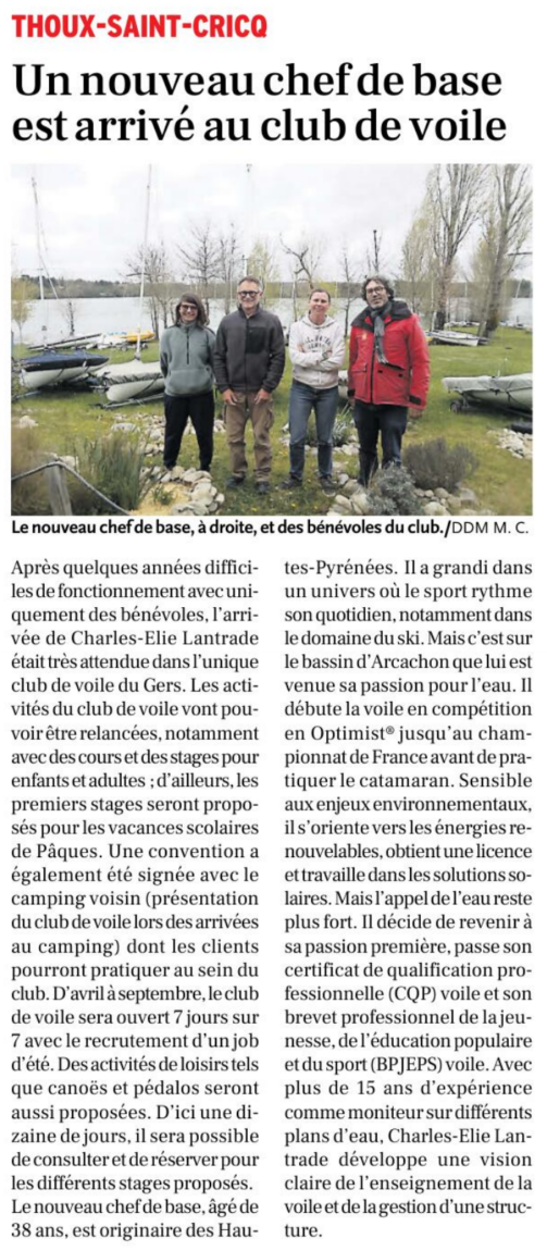 Ces dernières semaines, le Club de Voile de Thoux Saint-Cricq a été mis en lumière dans plusieurs médias locaux, à l’occasion de l’arrivée de son nouveau chef de base, Charles-Elie Lantrade, et du lancement de la saison 2026.